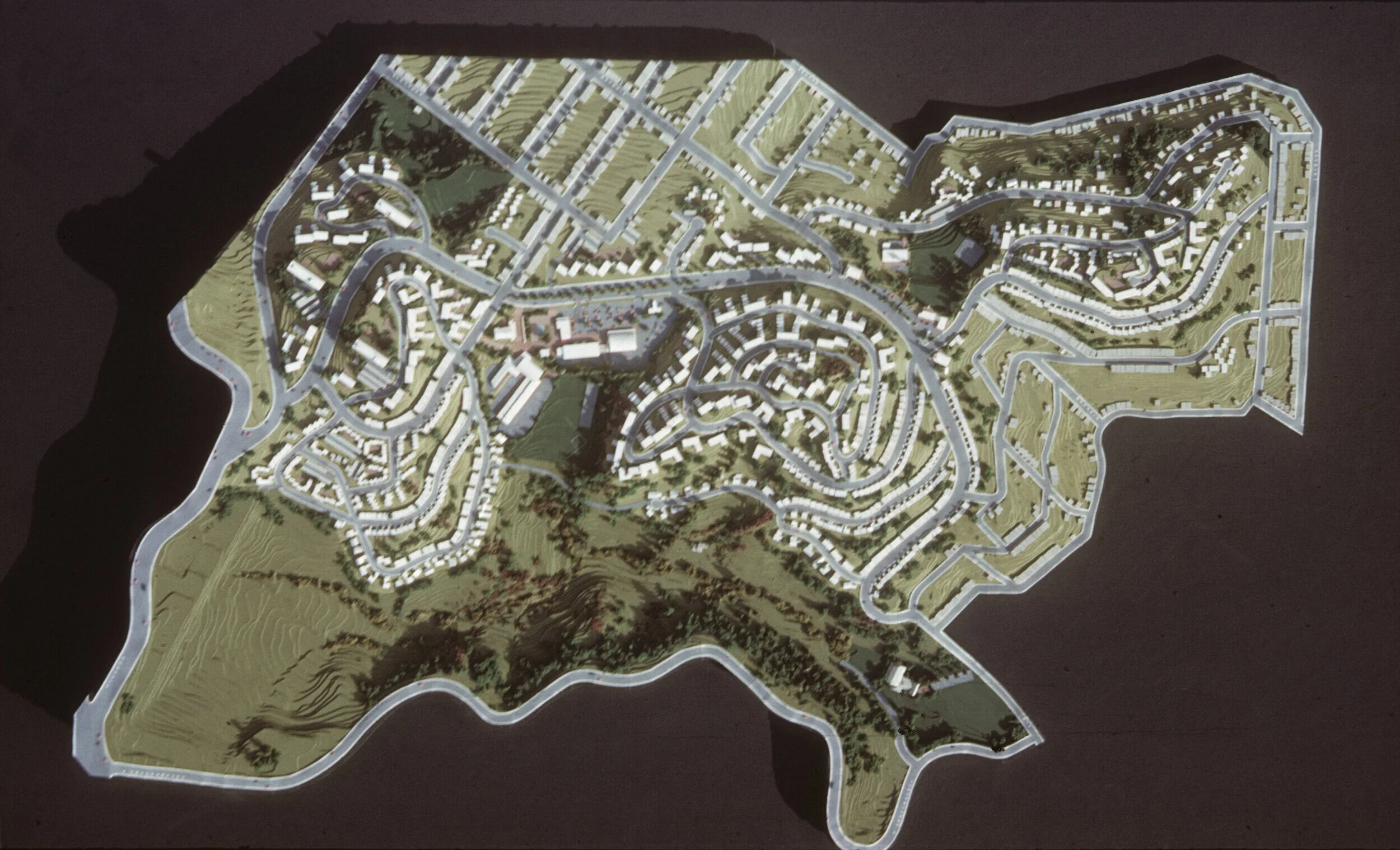 Until the mid-20th century, the hills of Diamond Heights in San Francisco were largely undeveloped—used primarily for rock quarrying and cattle grazing. Gridiron platting had long made development of streets and lots impractical, resulting only in paper streets. However, the post-WWII housing boom created significant pressures on the geographically limited area of San Francisco, which is surrounded by large bodies of water on three sides. In 1950, the recently created San Francisco Redevelopment Agency set its sights on Diamond Heights. In 1951, prominent local architect, Vernon DeMars developed a master plan for the area—the suburban-feeling “neighborhood unit” was consciously designed to take advantage of the incredible views of downtown and the San Francisco Bay, and to accommodate a racially and economically diverse community.
